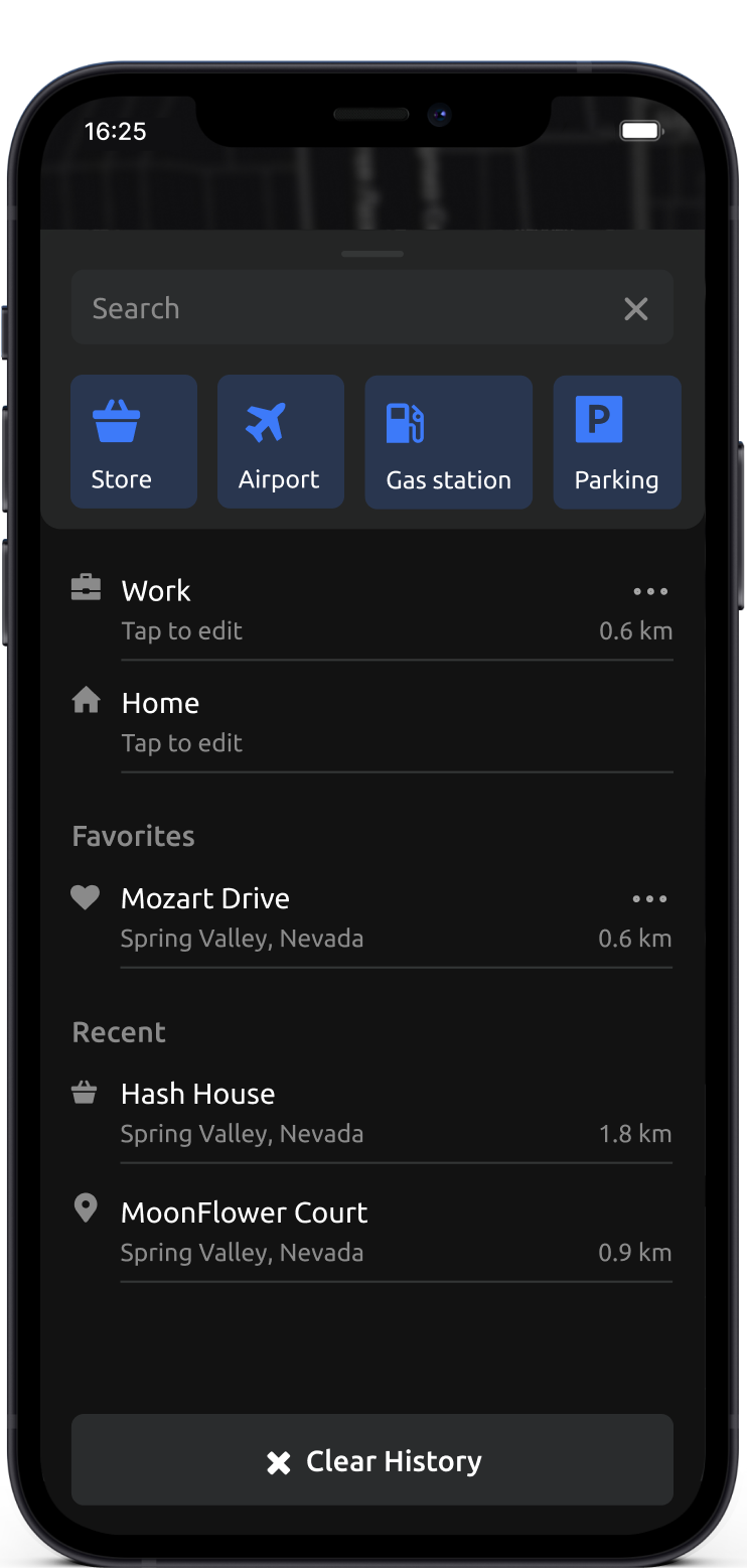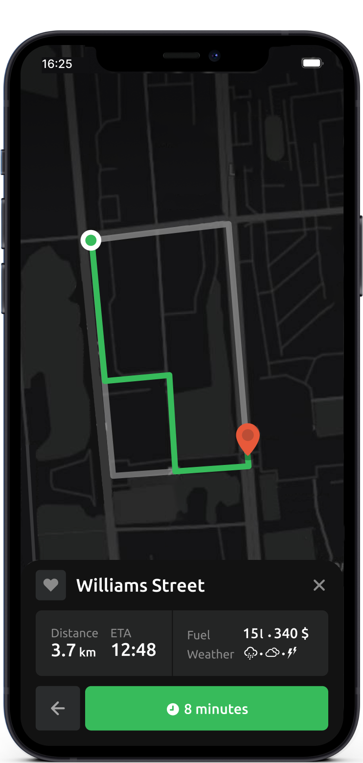 You can select a destination point from the search bar or by tapping it on the map. If a driver often visits the same locations, they can be added to Favourites.