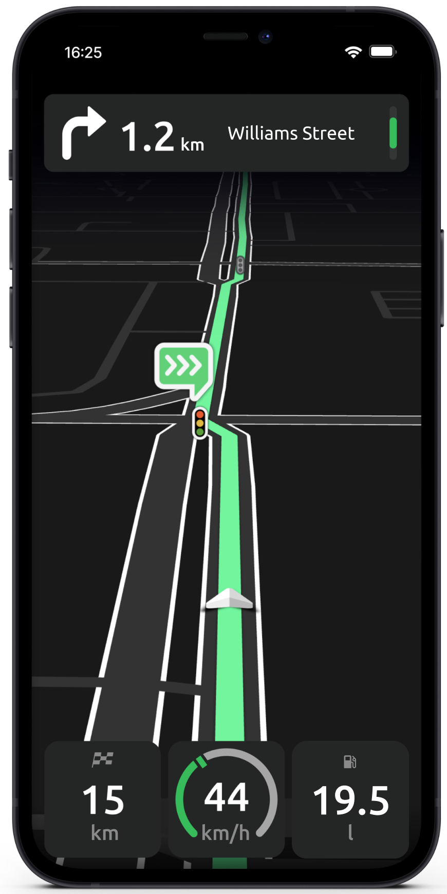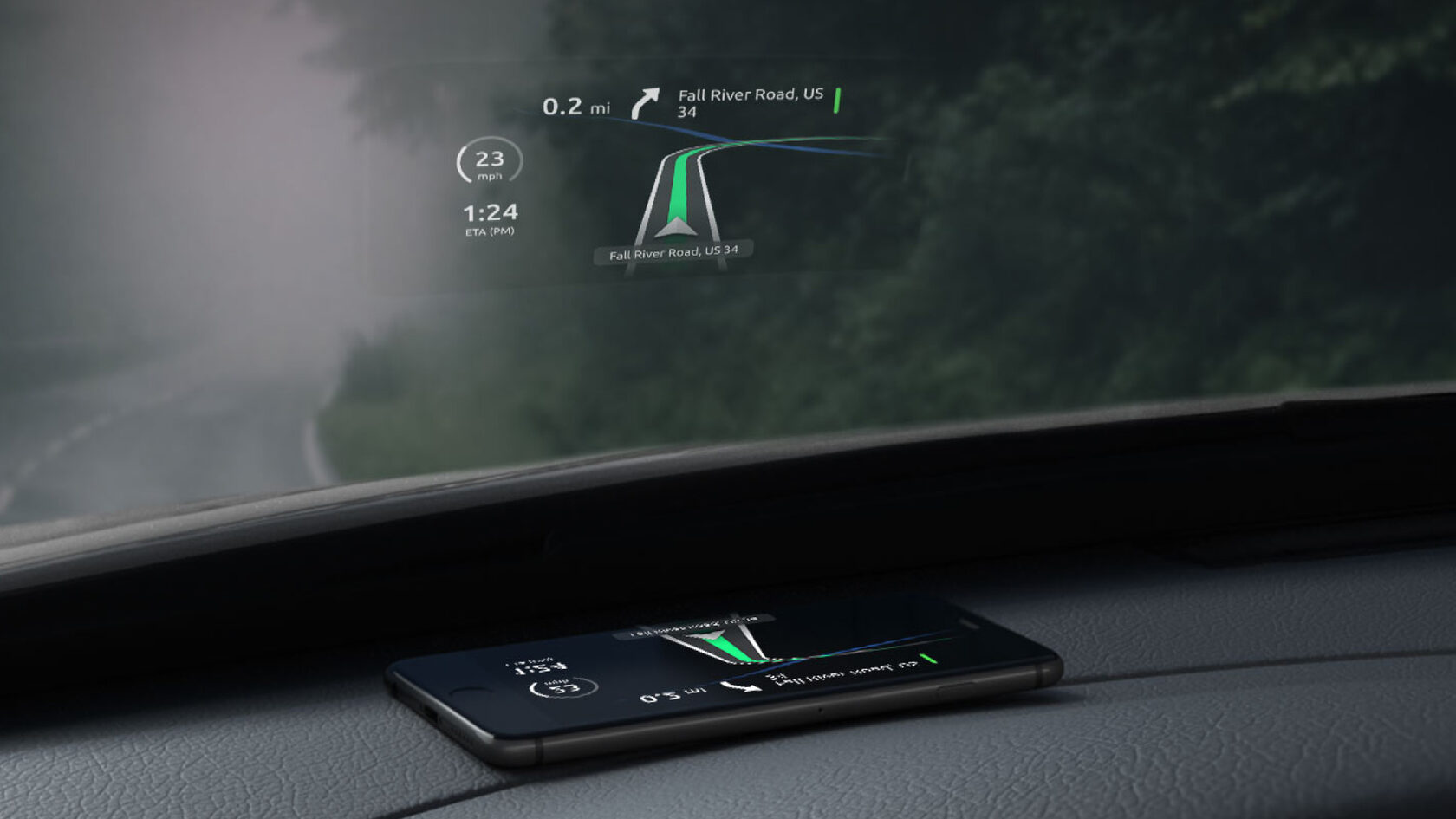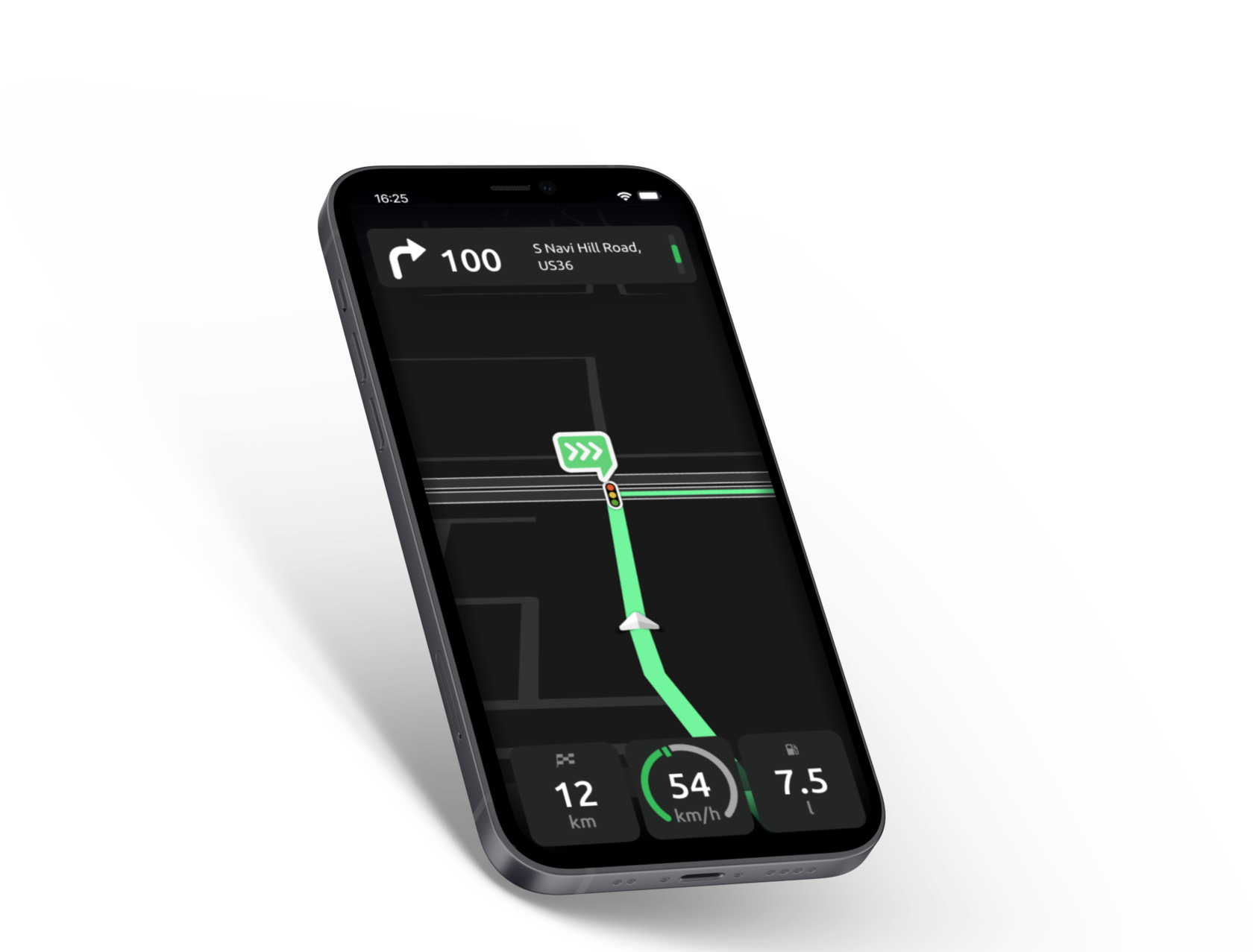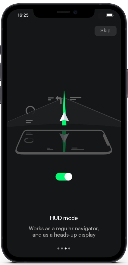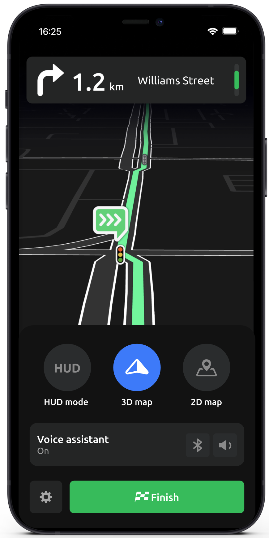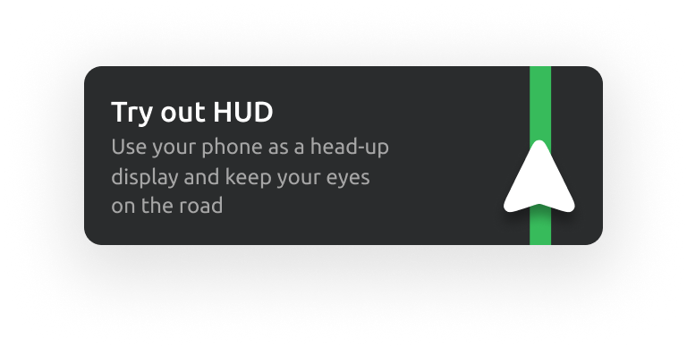HUD mode is a mirroring of 3D maps. Simply place your phone on the dashboard to project the map onto the windshield. This way, all the necessary info is always in front of your eyes and doesn't distract you from driving.