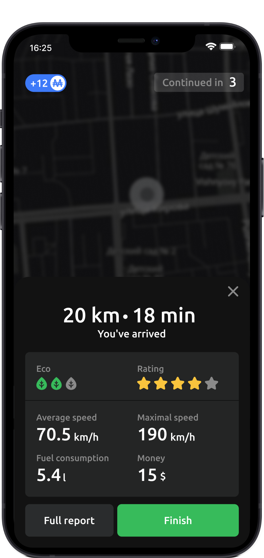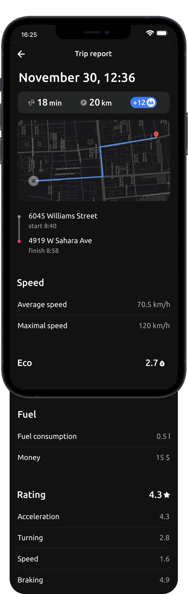 At the end of the trip, statistics on key driving parameters are displayed. You can view the trip history and statistics in the user profile.